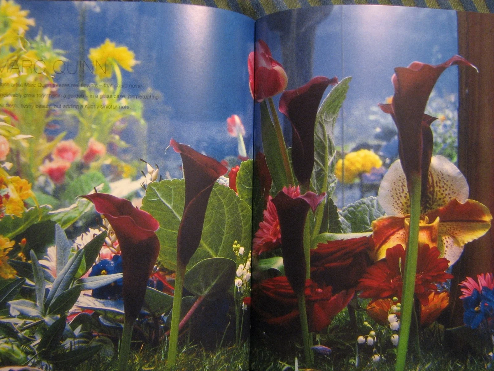A particular artist she shares with us is Marc Quinn, also British, born in the mid 60's. The image I have included here...yes, I know it is sideways and no matter how I have tried to correct this, it has a mind of its own...please turn your head sideways to view!...is a piece he entitles Garden, 2000. What is totally fascinating about this work is that it is a whole garden full of plants which could never grow together kept in cryogenic suspension in a glass case...a frozen garden!! Wow!